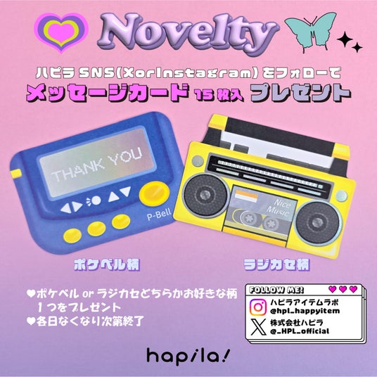 ハピラ公式SNS(X、Instagram)をフォローしていただいた方には、ポケベル柄、ラジカセ柄のメッセージカードをプレゼントいたします。