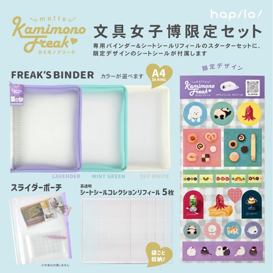 ラベンダー、ミントグリーン、オフホワイトの3色展開のファスナー付バインダーファイル1点、シートシールコレクションリフィール5枚、規格外のシールや小物の収納、一時保管など自由に使える便利なスライダーポーチと、文具女子博2024でしか手に入らない限定のシートシールがセットに。