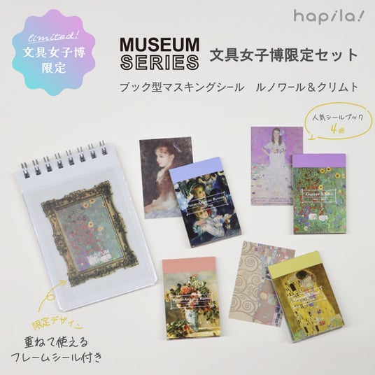 有名絵画をモチーフにした「ミュージアムシリーズ」のルノワール&クリムトのシールブック4種セット。文具女子博2024限定の重ねて使える額縁モチーフのフレームシールがセットになっています。