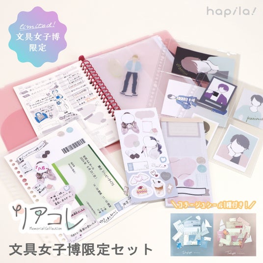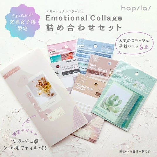 手帳デコやコラージュに最適な「Emotional Collage」シリーズをランダムで6点詰め合わせにしました。文具女子博2024でしか手に入らない、コラージュ風シール用ファイル付きの限定セットです。