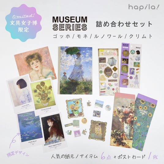 有名絵画をモチーフにした「ミュージアムシリーズ」のゴッホ柄、モネ柄、クリムト柄、ルノワール柄の紙モノ6点セットです。全8種展開。文具女子博2024でしか手に入らない、限定のポストカードがセットになっています。