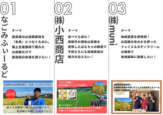 兵庫県三木市では、県内で初めて新たな資金調達方法である「ふるさと納税型クラウド ファンディング」を活用した三木市ふるさと納税返礼品開発支援事業を実施してお り、魅力あるふるさと納税返礼品の開発を支援しています。 今年度は 3 つのプロジェクトがスタートし、それぞれが地域資源「酒米 山田錦」 の魅力を更に広げるプロジェクトを実施します!