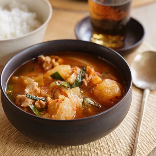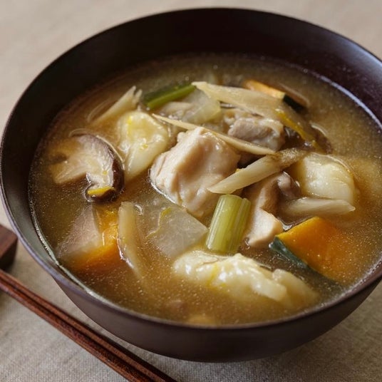 野菜に肉や魚、卵などのタンパク質を加えた具だくさんのスープです。あとは主食だけで、しっかりとした一食になります。