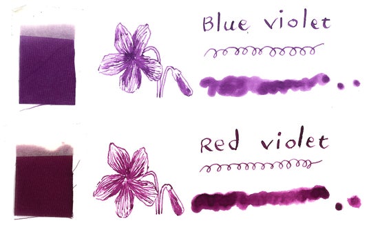 岡崎弘子がもっとも好きな花の「すみれ」をイメージしたインクです。赤紫色と青紫色の2種類のすみれを表現しました。横浜・関内にアトリエを持つ布花作家「utopiano(ユートピアノ)」とコラボし、2色のすみれ色に染色した布をもとにインクを調合しています。インクボトルのラベルは、繊細で柔らかなイラストを手掛けるアーティスト「hikari | 日香里」が制作します。