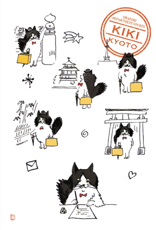 「岡崎百貨店」のエンブレムと、オリジナルポストカード3種を手掛けたデザイナー吉田愛氏が、描きおろした新作ポストカードです。岡崎弘子の愛猫「キキ」が京都を旅する様子をイメージして描いた楽しいデザインです。