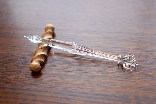 「Seed Lampwork」 平野元気(ひらのげんき)氏作製。岡崎が愛してやまない紅茶をイメージしたガラスペン。平野氏が実際に紅茶を飲みながらイメージを膨らませた作品です。ティーポットに光を通すと、揺らめく光が素敵な輝きを放ちます。