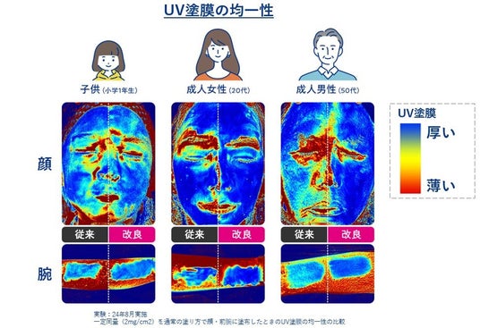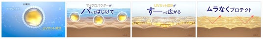 過去4回の改良を経て、このたび、マイクロパウダーで包み込んだUVカット成分を新たに配合し、「均一塗膜技術」を進化。剤を肌表面に塗布した際、マイクロパウダーが瞬時に崩れ、UVカット成分がすーっと均一に肌上に広がります。
