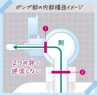 最後まで外気に触れず清潔に使える。2つの弁で、剤が逆流しない、密閉して外気に触れない