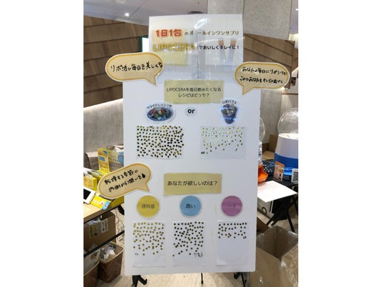 佐藤薬品工業株式会社佐藤薬品工業株式会社(本社:奈良県橿原市 代表取締役:佐藤雅大)は、令和6年(2024年)11月9日(土)と10日(日)、近畿大学経営学部(大阪府東大阪市)経営学科教授 布施匡章ゼミと、産学連携共同研究の一環としてリポソーム型ビタミンC配合の美容サプリメント「LIPOCERA(R)(以下、リポシーラ)」のPOPUPイベントをなんばマルイで開催し、2日間でのべ768人の来場者を迎えました。このイベントは、佐藤薬品工業がリポシーラの新規購入者層の獲得に加え、消費者の日常的な継続摂取の促進に課題意識をもっていたことから、サービスデザインを用いて企業の課題解決研究を行う近畿大学経営学部布施ゼミに共同研究を依頼したことを契機に開催したもので、両者がそれぞれリポシーラのアレンジレシピを考案して来場者に毎日摂取したいと思う方のレシピに投票をしてもらうイベントを通じて、消費者が楽しく日常的にサプリメントを摂取する方法を提案しました。