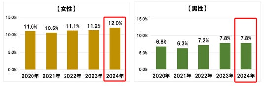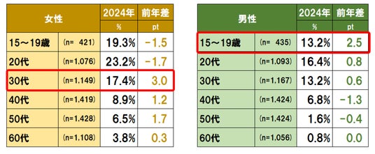 1年以内の美容医療の利用率は、女性12.0%(前年差0.8ポイント増)、男性7.8%(前年差なし)で、ここ5年緩やかな増加傾向にある。前年からは、女性30代(前年差3.0ポイント増)、男性15~19歳(前年差2.5ポイント増)が他の年代に比べて大きく増加している。