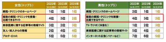 「複数の病院・クリニックを検索・比較できるサイト」が重要な情報源として年々順位が上昇。2024年には男女ともに2位にランクアップしている。