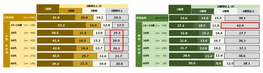女性の複数施術経験率は増加傾向で、20代~40代では25%以上が4種類以上の施術を経験している。男性では15~19歳で4種類以上の施術を経験している割合が40%を超えている。