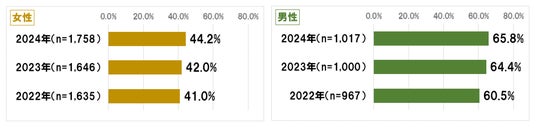 美容医療のリピート経験率(※2)は緩やかな増加傾向にあり、女性が44.2%、男性が65.8%。