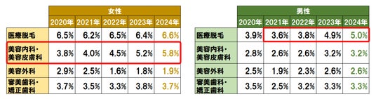 男女とも「医療脱毛」「美容内科・美容皮膚科」が、ここ5年で最も高いスコアになっている。特に、女性は「美容内科・美容皮膚科」の利用率が4年連続で増加、男性は「医療脱毛」が3年連続で増加。