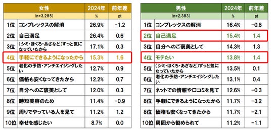 男女ともに「コンプレックスの解消」が美容医療を受ける理由として最も高い。前年からの増加幅が最も大きかったのは、女性は4位「手軽にできるようになったから」。男性は2位「自己満足」と4位「モテたい」。