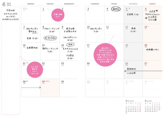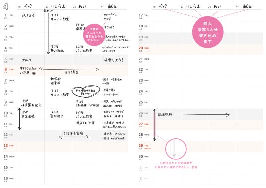 今までの手帳では、家族のスケジュールがパパッと見られない、書けない。そんな悩みが解消します。家族のスケジュールがパッと見開きで1か月分把握できる、ファミリーマンスリーページ。毎日の夕食の献立も書き込めます。日付をまたぐ線が引きやすいドット入り。シングルの方も仕事とプライベートで区分けして書き込めるので、ご自身に合わせてご使用いただけます。