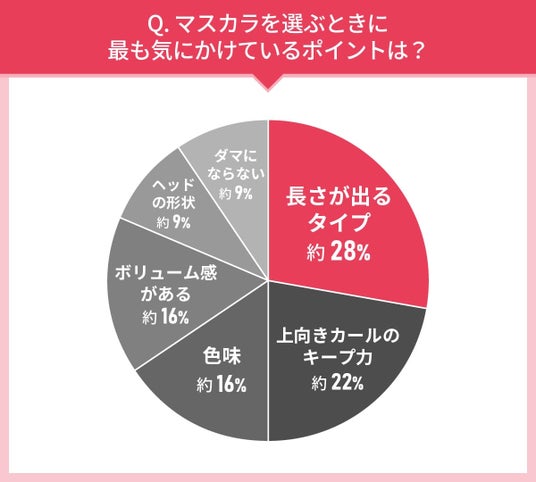 最も多かったのが「長さが出るタイプ」の約28%でした、次いで「上向きカールのキープ力」が約22%と、同等の結果に。「色味」や「ボリューム感」などを重視している人も比較的多く、マスカラはメイクの印象を大きく左右するアイテム、といった認識があることがわかります。また、「ヘッドの形状」や「ダマにならない」というポイントは、使いやすさを重視しているといえるでしょう。