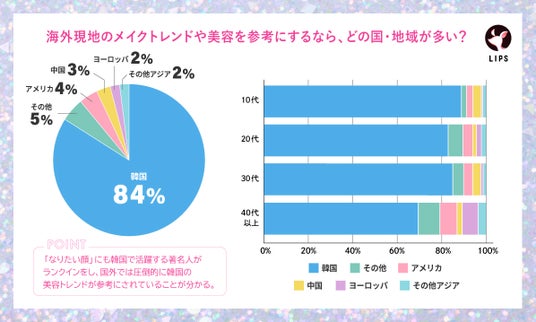 全体の80%以上が国外では「韓国」の美容情報を参考にしていると回答、各世代を見ても「韓国」と答える割合が1番多くなりました。