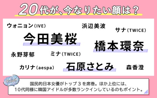 TOP3には橋本環奈さん・ウォニョンさん(IVE)・浜辺美波さんが選ばれ、昨年の韓国アイドル上位独占からガラッと変わったランキングに。