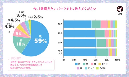 最後に「今1番キレイにしたいパーツ」についてアンケートをしたところ、全世代で半数以上が「肌」と回答、その次に「髪」と答える割合が多くなりました。