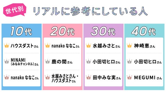 「リアルにメイクや美容情報の参考にしている人」を聞いたところ、各世代「なりたい顔」とは異なるランキングの結果に。