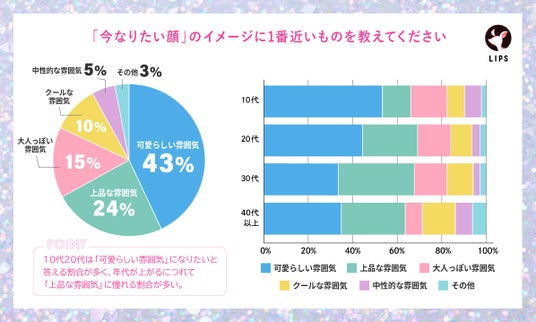 10代~20代は「可愛らしい雰囲気になりたい」と答える割合が1番多くなっており、30代~40代にかけて「可愛らしい雰囲気」と同じくらいに「上品な雰囲気になりたい」と答える割合が増える結果となりました。