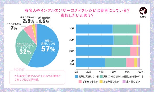 そんな「メイクレシピ」は、全体で57%の方が「実際に真似をしている」、全体の32%が「実際にはやったことはないが真似したい」と思っていると回答。