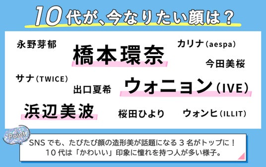 Z世代を中心に、BeReal.や証明写真など無加工の写真撮影が流行となっている点も影響をしているのか、10代から選ばれた「なりたい顔」は、加工無しでも映えるような、大きな瞳、透明感のあるキレイな肌といった顔のパーツの美しさが憧れのポイントになっていると考えられます。