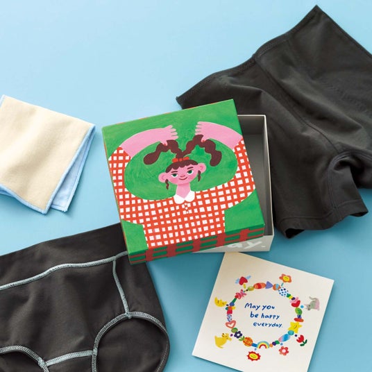 初めての生理のときにあるとうれしいショーツやポーチをかわいいイラストのボックスにぎゅっと詰め込みました。生理によって起こる体のさまざまな変化に不安を感じるお子さまや、生理についてどのように伝えたらいいのか......と悩まれているご家族のために、生理ケアや思春期のからだの変化について解説したリーフレット付きなので、親子で読んで話し合っておけば、安心して備えることできます。このボックスがお子さまのからだの健やかな成長を見守り、やさしく支えてくれる存在になりますように。