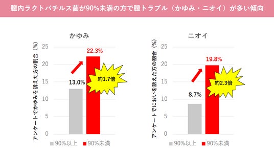 【調査結果】デリケートゾーンの悩みと膣内フローラとの関係が明らかに!~膣内ラクトバチルス菌率9割未満で、かゆみ、ニオイトラブルがそれぞれ約1.7倍、2.3倍に~