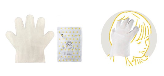 (写真上)頭部全体をあたためる耳ボア付きキャップ(写真下)洗い流しやふき取りがいらないミトン型のドライシャンプー