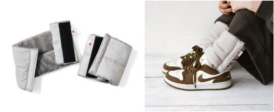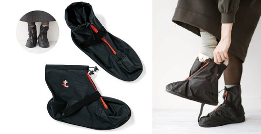 (写真上)雨や雪、泥の侵入から足を守る生活防水のシューズカバー(写真下)軽量であたたかな中わた入りのアンクルウォーマー