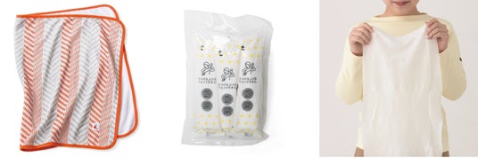 (写真上)親指を出して使えるサムホールも付いていて指先フリーのアームウォーマー(写真左下)ふんわりとした起毛素材のブランケット(写真右下)60×30cmで大判の厚手のウェットタオル