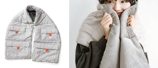 【ポケット付きあったかベストマフラー】寒さを感じた時、さっと羽織れる中わた入りのマフラー。軽量でもあたたかく、寒さで冷えやすい首や肩甲骨まわりを効率的にあたためてくれます。首に巻いたり、スナップを留めてベストにしたりして体感温度を調節でき、アウターと合わせてもお使いいただけます。首もとにスナップボタンが付いているのでずり落ちも軽減します。