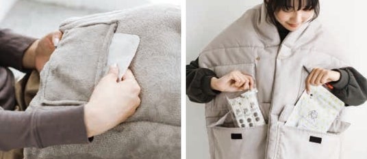 (写真左下)首~肩甲骨に当たる部分にカイロが入るポケット付き。太い血管が通る肩甲骨まわりをあたためると効果的です。(写真右下)大きくて開けやすいフラップ付きポケット。ウェットタオルや簡易トイレを入れてポーチ代わりにできます。