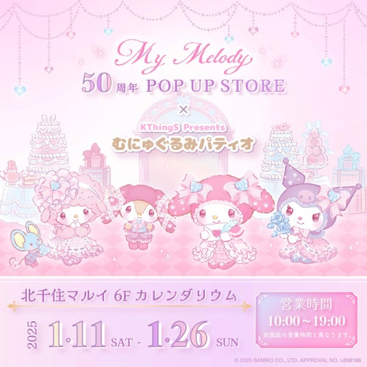 株式会社KThingS(本社:東京都中央区)の運営する「My Melody 50周年 POP UP SHOP × むにゅぐるみパティオ」の期間限定ショップが北千住マルイ6Fカレンダリウムで2025年1月11日(土)~1月26日(日)の期間オープンいたします。ショップでは、新商品のむにゅぐるみマスコットを始めとした様々なマイメロディの商品をご用意しています。