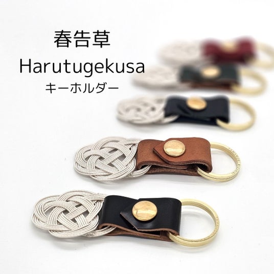 その他雑貨は存在感のあるキーホルダー「春告草(はるつげくさ)」がございます。こちらは革と貴金属のお取合せで上品かつカジュアルに御仕立てしております。