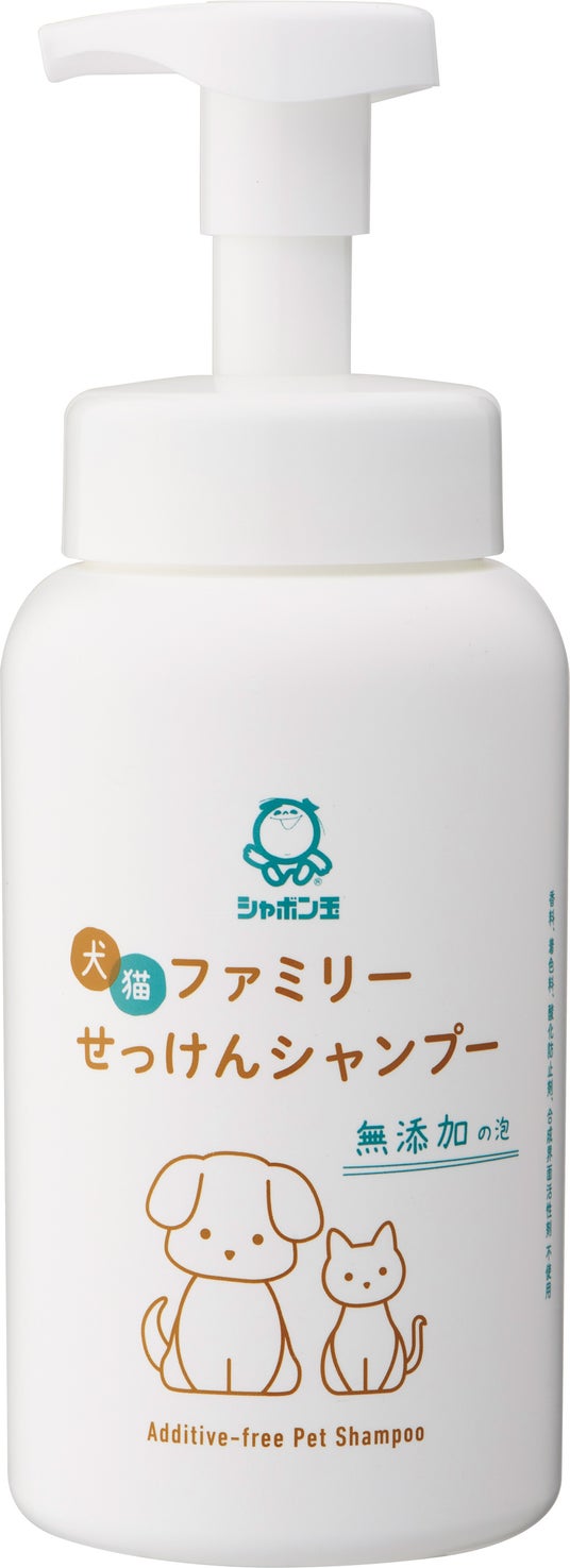 「犬猫ファミリーせっけんシャンプー」は、シャボン玉石けんが長年こだわる、香料、着色料、酸化防止剤、合成界面活性剤不使用の無添加石けんをペットの分野に応用し、開発したものです。薄く繊細な犬猫の肌も人の肌と同じようにやさしくケアしてほしいという考えのもと、汚れやにおいをスッキリと洗い流し、思わず抱きしめたくなるサラサラふわふわな洗い上がりを追究しました。1プッシュでたっぷりの泡が出る泡タイプを採用し、泡立てが不要なことに加え、石けんの優れたすすぎ性でシャンプー時間の短縮をサポートします。また、タオルで手軽に拭き取り洗浄も可能です。