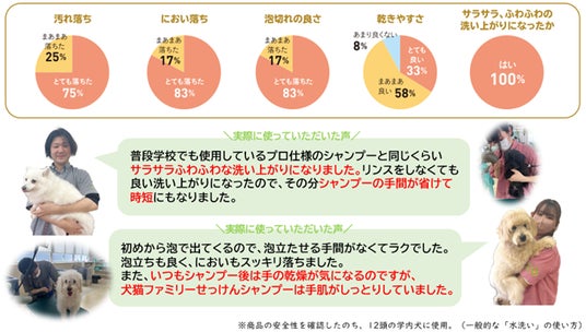 動物・海洋・ペット・自然環境の分野で活躍するための専門的な知識と技術を学ぶ福岡ECO動物海洋専門学校のペットトリマー専攻学生に「犬猫ファミリーせっけんシャンプー」を使っていただき使用感を評価いただきました。