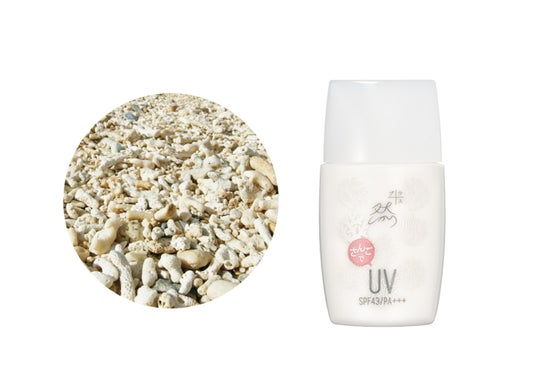 『さんごでUV』は、死んださんごが年月により風化し堆積してできたさんご末(沖縄県産)や微粉末の火山灰、酸化亜鉛、酸化チタン等の紫外線を反射(散乱)して肌を守る紫外線散乱剤を使用した無添加*³処方の日焼止めです。