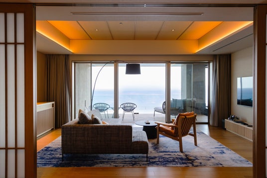 おおらかな伊豆山にあるやすらぎと相模湾の開放感から得られるくつろぎが享受できる、「熱海・伊豆山 佳ら久」の最上階に用意された二つだけの客室です。お泊まりいただく方々がそれぞれ思い思いに過ごせるよう、主室と寝室の間を引き戸で仕切れる造りです。テラスには水盤を設け、その先に広がる水平線や空との一体感を演出しています。