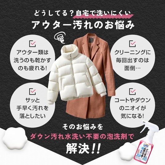 発売1ヶ月で大人気!SNSで話題沸騰の冬必須アイテム「クリーニング屋さんのダウン汚れ水洗い不要の泡洗剤」