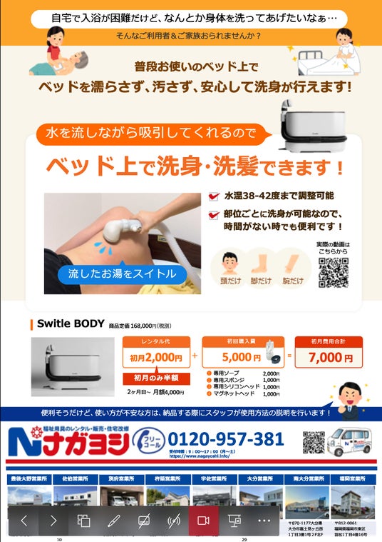株式会社ナガヨシ(本社:大分県豊後大野市緒方町、代表取締役社長:長吉友博)は、寝たきりの高齢者の清潔を保つための新しい福祉用具「スイトル・ボディ」を大分県内でのレンタルサービスとして正式に提供開始いたしました。