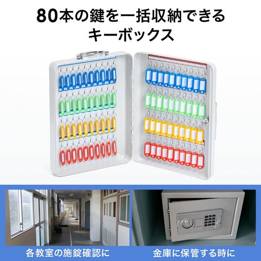 大容量鍵ボックス 200-SL120は1台で最大56本、200-SL121は1台で最大80本の鍵を整理・収納できる抜群の容量を誇ります。鍵が多いオフィスや施設、学校、家庭など複数の鍵を持つ場面で、鍵探しの手間を省くことができます。