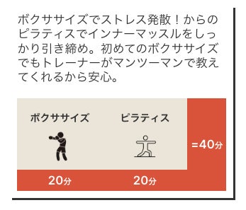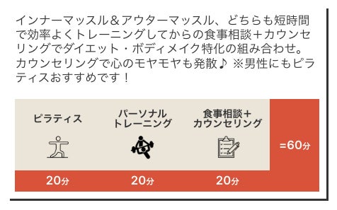 - オリジナルの6プログラムでパーソナルトレーニング(筋力トレーニング)、マットピラティス、ボクササイズ、整体&ストレッチ、食事相談、カウンセリングのプログラムが、目的やその日の気分に合わせて1つのジムですべて受けられる