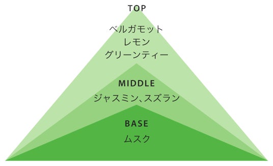 新緑のようなフレッシュなグリーンの中に、爽やかなシトラスが香る、清涼感のあるグリーンティーの香り。