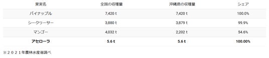 アセローラの国内シェアは、沖縄県が100%です。 がしかし、同じ国内シェア1位の果実、パイナップル、シークワァーサー、マンゴーと比べると、極端に少ない生産量であることが如実に表れています。 デリケートであるが故に、産業としての魅力に欠けることも事実で、加工技術の向上、流通形態の改善がクリアになれば、沖縄県にとっても一大産業の一角に成り得る、大きなポテンシャルを秘めた果実なのです。