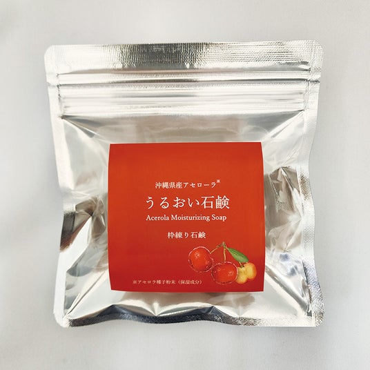 アセローラエキスは、沖縄県産アセローラ種子を100%使用しました。保湿力の高いアセローラエキスはじめ、オリーブ油、ヤシ油、シア脂等、保湿訴求の高い成分を配合。更には、ヒアルロン酸、セラミド、コラーゲン、ハチミツ等、皮膚コンディショニングを整える成分をふんだんに配合、”うるおい”を追求した高機能美容石鹸です。製法はじっくりと丁寧に枠練り製法で仕上げています。