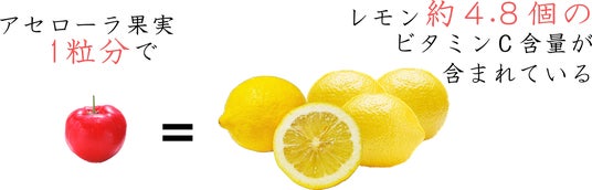 アセローラの魅力は、世界中の果物の中で最も多い「ビタミンC」の含有量です。100g中に1,700mgの含有量は、レモンと比べると約34倍もの含有量に匹敵します。アセローラを1粒食べることで、レモン約5個分のビタミンCを摂取することになります。