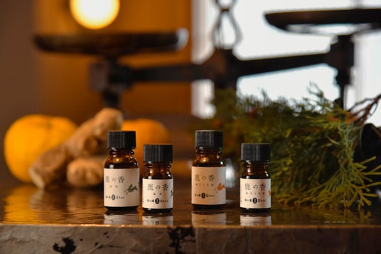 日本国内の天然木を100%使用し、北国の深い森に流れる凛とした空気を表現したシグネチャーアロマ「鹿の香 森林」。この森林の香りをベースノートに高知県産の柚子と生姜のアロマを調合し、古くから親しまれる日本のぬくもりを表現した「鹿の香 柚子と生姜」。